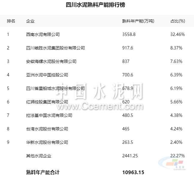 根據(jù)中國(guó)水泥網(wǎng)發(fā)布的2020中國(guó)水泥熟料產(chǎn)能百強(qiáng)榜之四川省熟料產(chǎn)能得知,截至2020年,四川水泥熟料年產(chǎn)能合計(jì)10963.15萬噸,其中,西南水泥占比最大為32.46%。