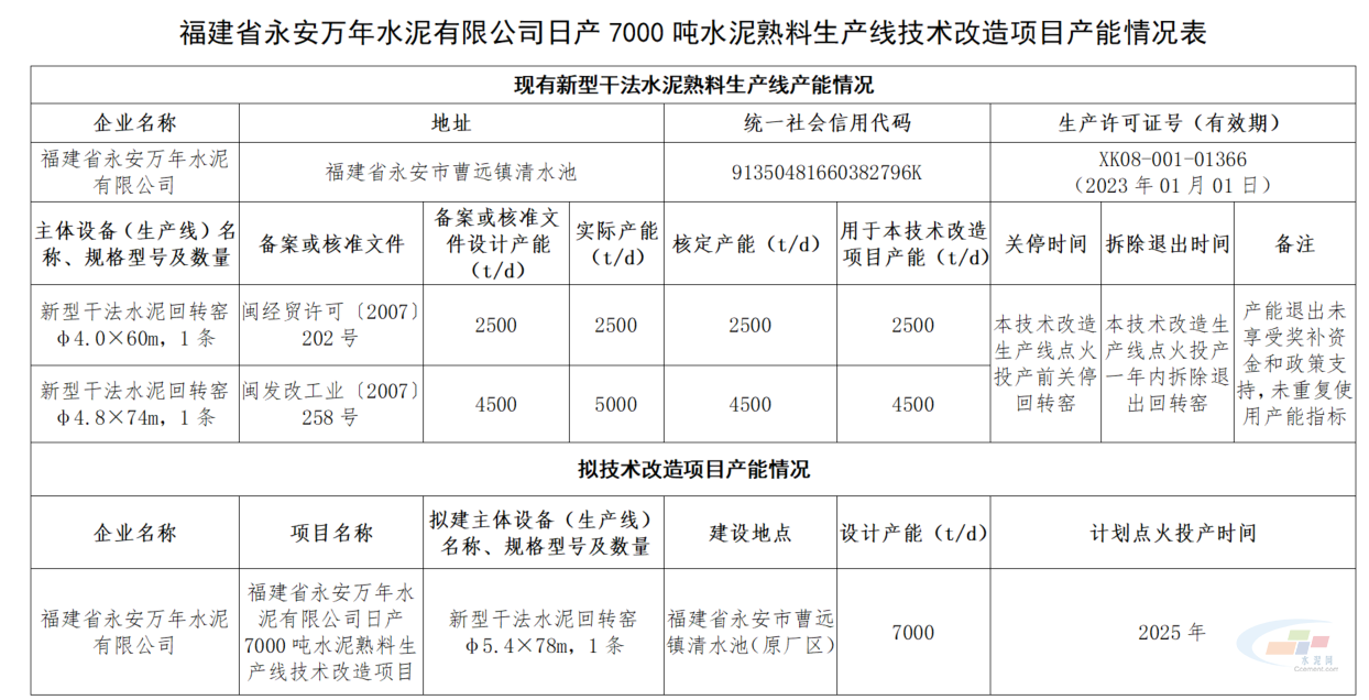 6月18日,福建省工信廳發(fā)布了關于福建省永安萬年水泥有限公司日產7000噸水泥熟料生產線技術改造項目產能情況的公示。公示期為2021年6月18日至2021年6月24日(5個工作日)。